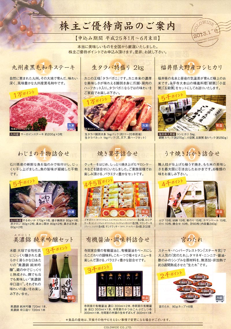 2012年9月末現在の株主様への優待品
