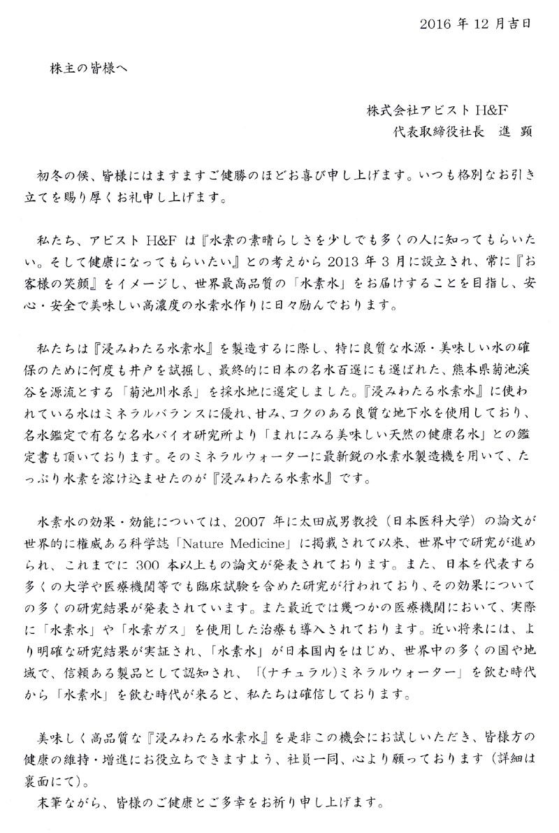 アビストの期末配当金計算書に、水素水に対する考えが同封されていました。