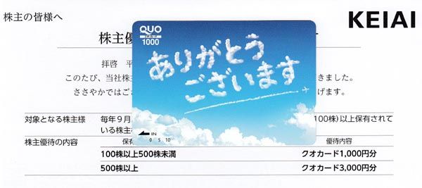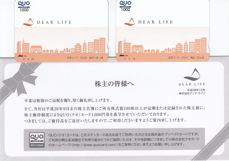 買値の2倍半になったのですでに売却済みです。まさかクオ・カードが貰えるとは思ってもいませんでした。