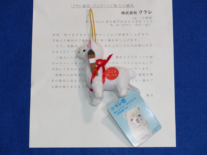 優待は今年新設されたもので、画像は例年の株主通信内のアンケート回答謝礼のミラバケッソと鳴くアルパカマスコットです。