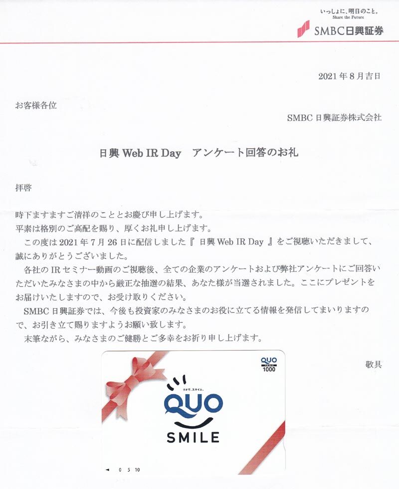 °ìºòÆü¤ÎQUO¥«¡¼¥É¤Ë³¤¤¤Æ¡¢A4¤Î¤æ¤¦¥á¡¼¥ë¤ÇÍ¥ÂÔ·ô¤ÈÍ¥ÂÔ¥«¥¿¥í¥°¤¬ÆÏ¤¤Þ¤·¤¿¡£