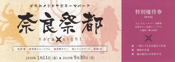 ミ・ナーラ(http://www.mina-ra.com/)内テーマパーク「奈良祭都」忍者タウン及び金魚ミュージアムの入場料を一律500円に割引