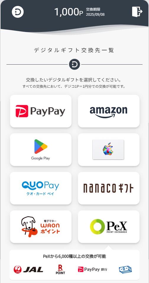 ※「デジコ」を通じて「Amazonギフト券」、「App Store&i Tunesコード 」などのデジタルギフトに交換可能。