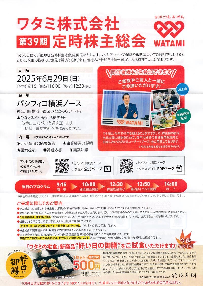 [7522]ワタミ 株主総会でお弁当2個まで4