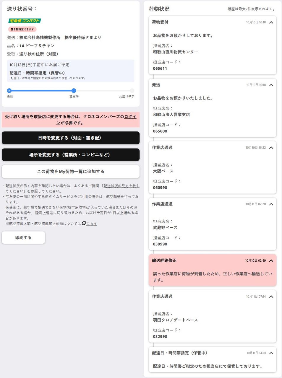 またまた、クロネコの配送ミスです。埼玉県内の間違った武蔵野ベースに荷物が行ってしまったため、一旦東京羽田に戻してからの再配送になりました。
