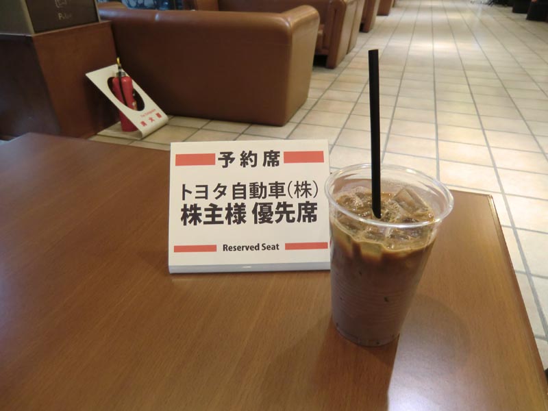 その後社食に案内されて、ブルーの懇親会入場票の株主は1階の喫茶店へ、ピンクの入場票の株主は9階の特設会場にわかれての遠隔参加となりました。